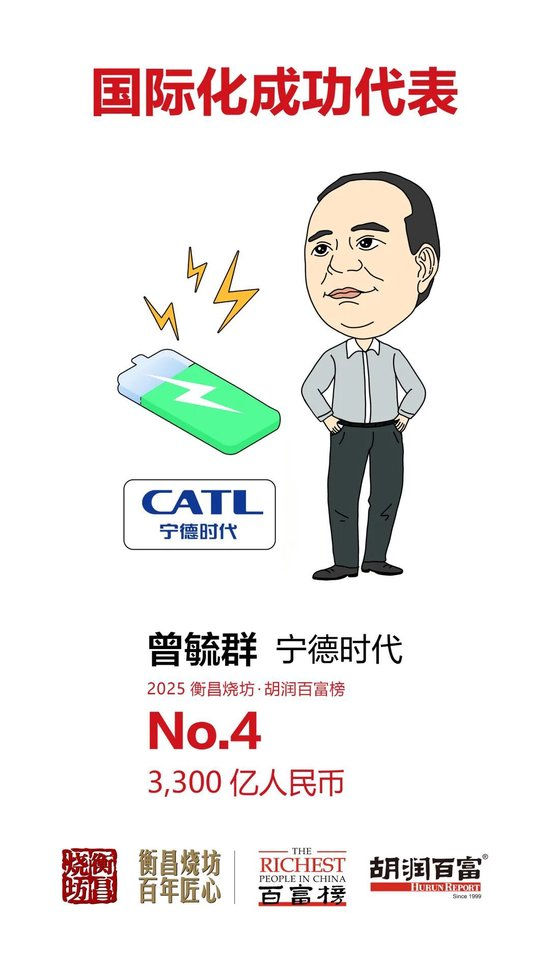“新能源汽车及电池领域,受益于政策利好与全球市场需求双轮驱动,小米的雷军与宁德时代表现尤为亮眼。雷军财富比去年增加近2000亿元,是今年财富增长最多的企业家;宁德时代的曾毓群、黄世霖及另外五位成员财富均增长近70%,曾毓群以3300亿元再次进入榜单前五,黄世霖则以1500亿元进入前30。”