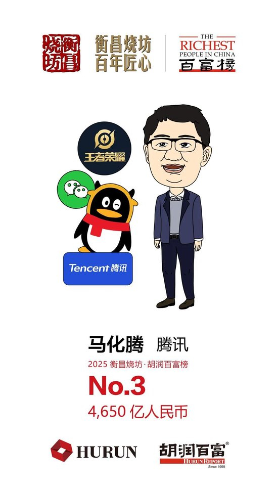 54岁的马化腾财富比去年增长1500亿元(+48%),以4650亿元保持第三。去年,腾讯广告收入增长20%,本土游戏业务增长10%,微信小店GMV翻至1.92倍,全年净利润上涨68%。同时,积极布局AI技术、拓展国际游戏市场,公司市值已接近重回6万亿元。这一增长也与港股表现密切相关。马化腾和丁磊是胡润百富榜二十多年来的前十“常青树”,马化腾先后14次进入前十,丁磊也累计11次位列前十。马化腾最近一年分红30亿元。