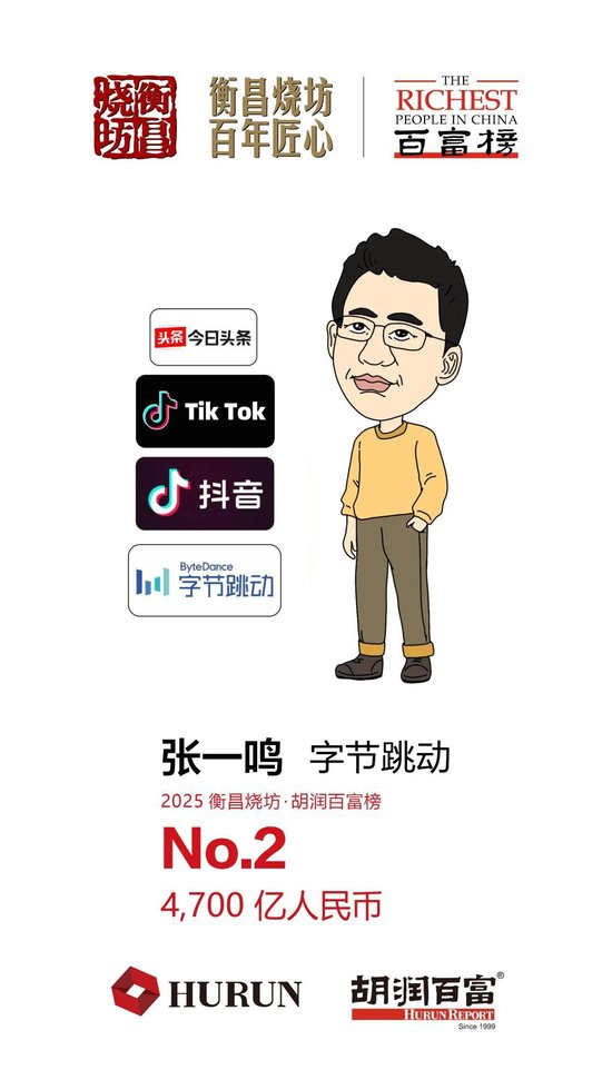 ● 42岁的字节跳动创始人张一鸣财富增长1200亿元,这得益于AI业务进展推动公司估值继续走高,但他仍以4700亿元退居第二,让出去年首富头衔。根据第三方机构QuestMobile的数据,截至2025年8月,字节跳动旗下AI助手“豆包”月活跃用户达到1.57亿,位居国内第一位。