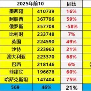 中国汽车出口市场格局正在发生静默但深刻的变革。2022年至2024年期间,俄罗斯市场曾是中国汽车出口的核心增量来源,但2025年这一格局发生根本性转变。俄罗斯市场出口量同比暴跌58%,减少近50万辆。 与此同时,新兴市场异军突起,阿联酋同比增长59%,澳大利亚增长68%,菲律宾增长60%,英国增长49%,阿尔及利亚增幅高达275%。乘联分会秘书长崔东树表示:“市场格局已经从去年依赖俄罗斯市场,逐步转到中南美、欧洲表现相对较强的特征。”这种转变体现了中国汽车出口多元化发展的成功。