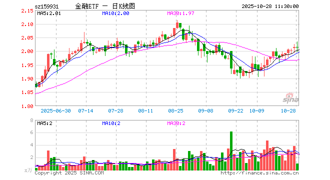 10月28日,截止午间收盘,金融ETF(159931)跌0.05%,报2.014元,成交额200.96万元。金融ETF(159931)重仓股方面,中国平安截止午盘涨0.23%,招商银行跌0.17%,兴业银行跌0.49%,东方财富涨1.15%,中信证券涨0.43%,工商银行涨0.63%,国泰海通涨0.21%,交通银行跌0.55%,农业银行涨0.98%,江苏银行跌0.64%。