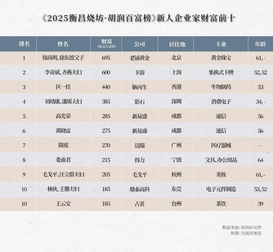 新人之首是来自老铺黄金的徐高明、徐东波父子,以695亿元财富跻身前100;其次是集换式卡牌龙头卡游的李奇斌、齐燕夫妇,财富600亿元。