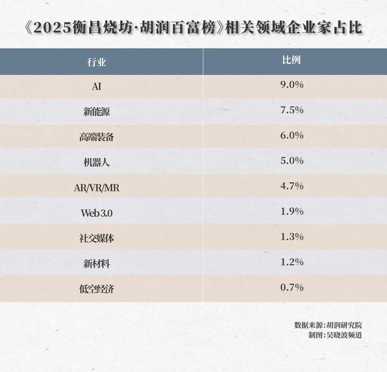 而若从“热门赛道”的维度看,聚焦AI领域的企业家占比已达9%,其次是新能源7.5%,高端装备6%,机器人5%,这些领域也有机会捧出一名财富新星冲击金字塔顶尖。