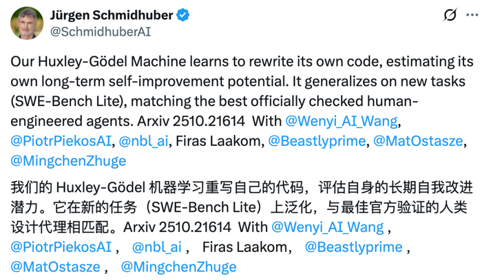 而在最近,Jürgen Schmidhuber 对当年提出的理论哥德尔模型进行了一次全新的尝试,构建了赫胥黎 - 哥德尔机,能够在 SWE-Bench Lite 上与官方验证的最佳人类设计的智能体相媲美。