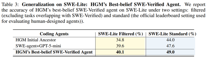 HGM 发现的智能体展现出卓越的跨模型泛化能力:当将其骨干模型从 GPT-5-mini 替换为更强大的 GPT-5 时,其强劲性能得以保持。在 SWE-Bench Lite 基准测试中,该智能体的表现与排行榜上最先进的人工设计智能体相当。