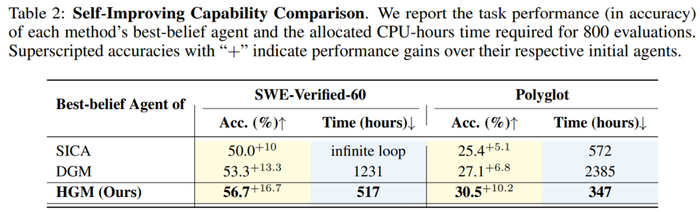 结果如表 2 所示,HGM 在性能与效率两个关键维度上,均显著超越了现有的自改进方法(DGM 和 SICA),确立了其优越性。