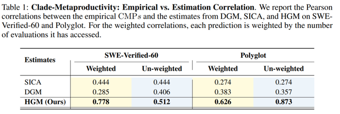 获得了显著更强的相关性:在 SWE-Verified-60 和 Polyglot 上的加权相关系数分别达到 0.778 和 0.626,未加权相关系数分别为 0.512 和 0.878,以显著优势超越了 SICA 和 DGM。