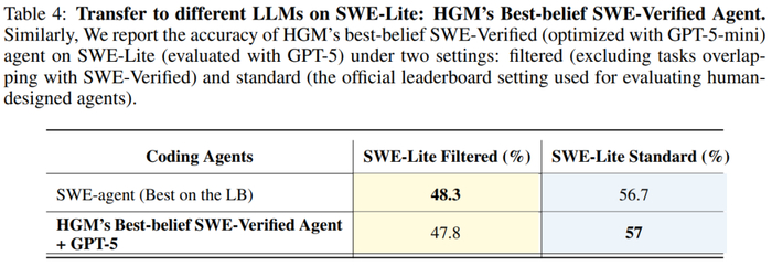更重要的是,HGM 展现出向其他编码数据集和大语言模型的强大迁移能力。使用 GPT-5-mini 在 SWE-bench Verified 上通过 HGM 优化的智能体,在 SWE-bench Lite 上使用 GPT-5 进行评估时,达到了人类水平的表现,与经过官方验证的最佳人工设计编程智能体的结果相当。
