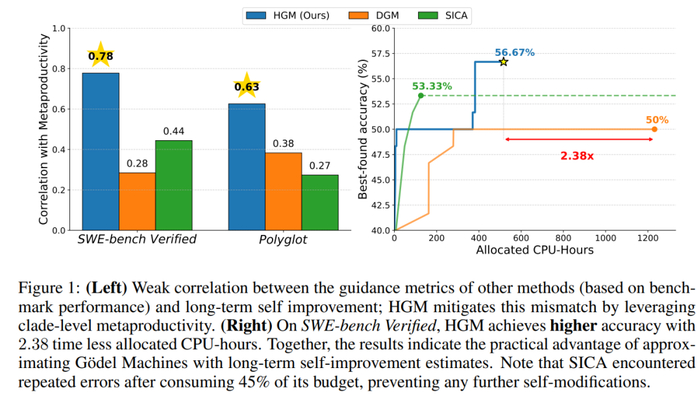 在 SWE-Verified-60 上,HGM 比 DGM 快 2.38 倍。