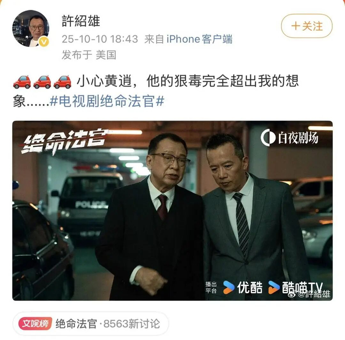 许绍雄最后一次在社交媒体上露面是10月10日,他在微博为《绝命法官》宣传。如今这条微博下,已满是送别的留言。