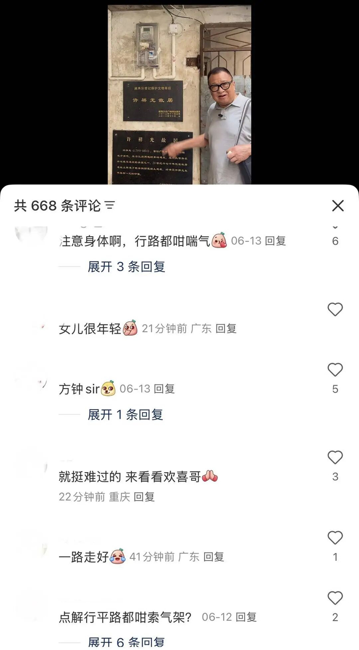 今年6月,他在社交平台发布“带女儿回广州旧居”的视频时,已经有网友注意到他走平地也总是喘气的问题,提醒他多多注意身体。