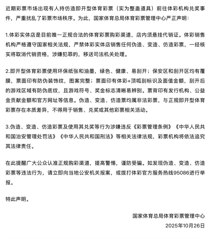 10月26日,国家体育总局体育彩票管理中心发布《关于近期出现仿造即开型体育彩票兑奖的声明》。声明称,近期彩票市场出现有人持仿造即开型体育彩票(实为整蛊道具)前往体彩机构兑奖事件,严重扰乱了彩票市场秩序。