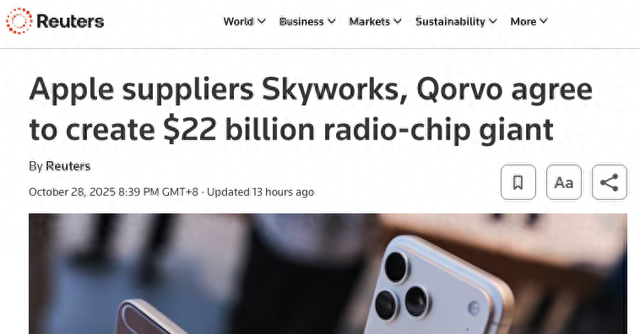 据悉,思佳讯与科沃均为苹果核心射频芯片供应商,但近年来面临苹果自研芯片的挑战。2025年iPhone 16e机型已部分采用苹果自研射频模块,导致两家公司订单承压。外媒认为,合并后,新公司将整合滤波器、功率放大器等关键技术,提供更完整的系统级解决方案,增强与苹果的议价能力。(青山)