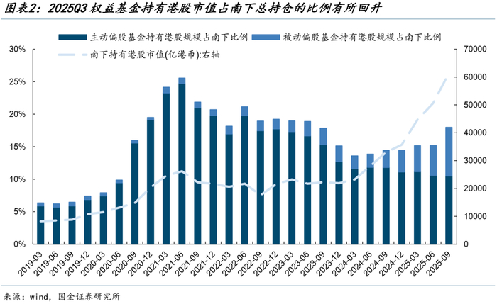 结合南下来看,2025Q3南下资金单季度净买入3999.85亿元,规模较二季度明显回升,但仍略低于一季度。从权益基金视角看,三季度权益基金持有港股市值占南下比例提升明显(从2025Q2的15.19%升至2025Q3的17.98%),结构上则依然延续了“被动化”的趋势,其中,被动偏股基金持有港股市值占南下比重从2025Q2的4.62%明显升至2025Q3的7.49%,而主动偏股基金持有港股市值占南下比重则从2025Q2的10.58%进一步降至2025Q3的10.49%。整体来看,南下的主要力量依然来自于公募之外(险资、个人等)。
