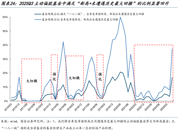 三是2025Q3满足净值新高且当季度未遭遇历史最大回撤的主动偏股基金比例显著回升,而从历史上看,这也往往是持仓大切换时期的特征。