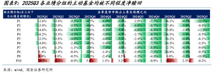 更进一步地,从不同业绩分组来看,2025Q3不同业绩分组的主动偏股基金均遭遇了不同程度的净赎回。但如果结合二季度的业绩来看,我们发现:仅连续在2025Q2、Q3均绩优的主动基金才在2025Q3被明显净申购。