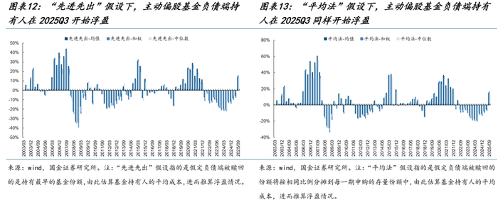 结合主动基金负债端的浮盈情况来看,基于我们的测算,无论最近8个季度的平均浮盈情况,还是基于“先进先出”法/“平均法”看基金持有人的整体浮盈情况:2025Q3均是主动偏股基金负债端持有人盈利开始转正的时点,而从历史经验看,“回本”是赎回概率最高的区间,这也解释了随着主动偏股基金业绩持续占优,其负债端赎回情况反而更加显著的现象。
