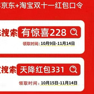 领取京享红包:京东APP搜「有惊喜228」,每天领三次,10月9日开领一直到11月11日,每晚8点有机会额外领取。
