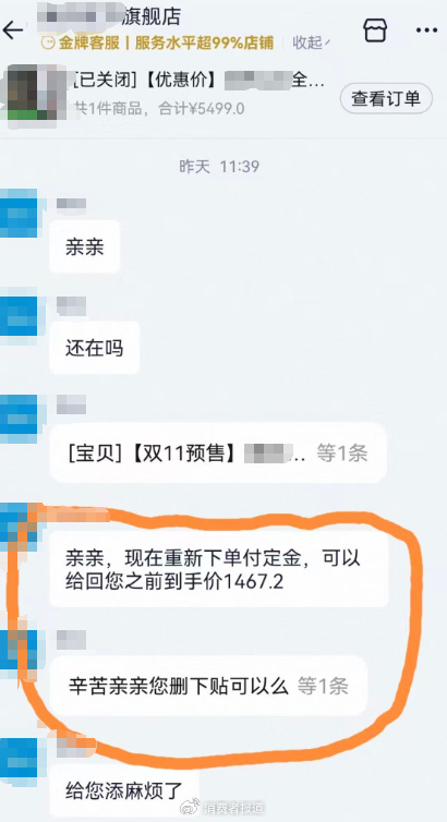 “今年‘双十一’是对买家的背刺。”有消费者表示,某品牌电视在“618”大促时的价格为3484元,“双十一”价格涨到4799元;另有消费者发帖称,某品牌净水器“双十一”的价格比“618”上涨了50%,该品牌售后专员向其表示,删帖后可以按照“618”价格结算。