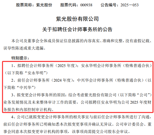 深交所主板上市公司紫光股份(000938.SZ)于2025年10月31日发布了《关于拟聘任会计师事务所的公告》。公告显示,综合考虑紫光股份有限公司(以下简称“公司”)业务发展情况及未来整体审计工作的需要,公司拟聘任安永华明为公司2025年度财务报告和内部控制审计机构。2025年度安永华明审计费用合计不超过人民币881万元(含税及各项费用),其中,财务报告审计费用不超过人民币791万元(含税及各项费用);内控审计费用不超过人民币90万元(含税及各项费用)。公司董事会提请股东会授权管理层根据具体情况决定2025年度财务报告和内部控制审计机构报酬。