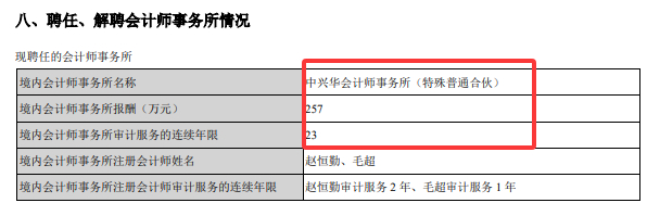 根据该公司2024年年度报告披露,该公司已与中兴华合作23年。2024年度支付中兴华257万元的审计费用。