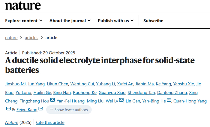 引用本文:Mi, J., Yang, J., Chen, L. et al. A ductile solid electrolyte interphase for solid-state batteries. Nature (2025).