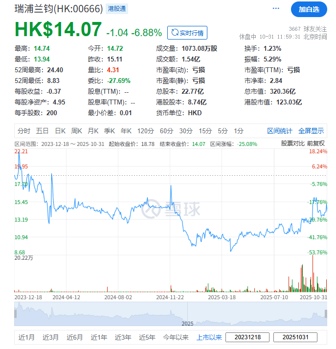 瑞浦兰钧(00666.HK)于2023年12月18日在港交所挂牌上市,当时IPO募资约21.24亿港元。截至午间收市,其每股收报14.07港元,较IPO发行价(每股18.30港元)跌23.1%,目前总市值约320.36亿港元。