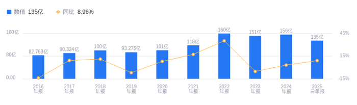 2025年三季度,新洋丰营业收入达134.75亿元,行业排名2/9,高于行业平均数74.33亿元和中位数73.19亿元,行业第一名云图控股营收为158.7亿元。当期净利润为13.96亿元,行业排名1/9,高于行业平均数4.33亿元和中位数1.55亿元,行业第二名史丹利净利润为8.24亿元。