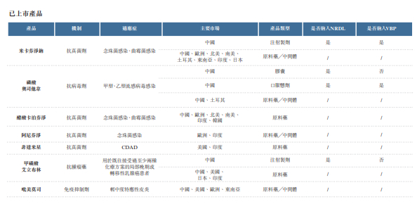 以下管线图总结了公司于最后可行日期的候选药物及主要已上市产品。