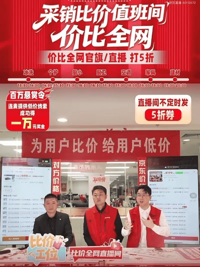 “京东拿出100万元现金,向全网发布‘比价悬赏令’!”主播语速飞快却条理清晰,她向观众详细说明规则:网友可使用京东自营家电价格,对比其他平台的品牌官方旗舰店或品牌直播间同款商品。如发现京东价高,即可申请直播连线提供低价线索,一经核实,京东将给予1万元奖励,以京豆形式发放,并现场调价至9折优惠,部分商品更会以5折价格在直播间限量抢购。