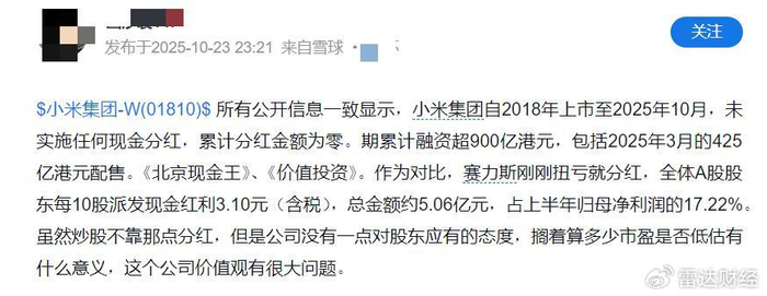 雪球上也有用户针对小米累计分红金额为零的情况表示,“虽然炒股不靠那点分红,但是公司没有一点对股东应有的态度。”