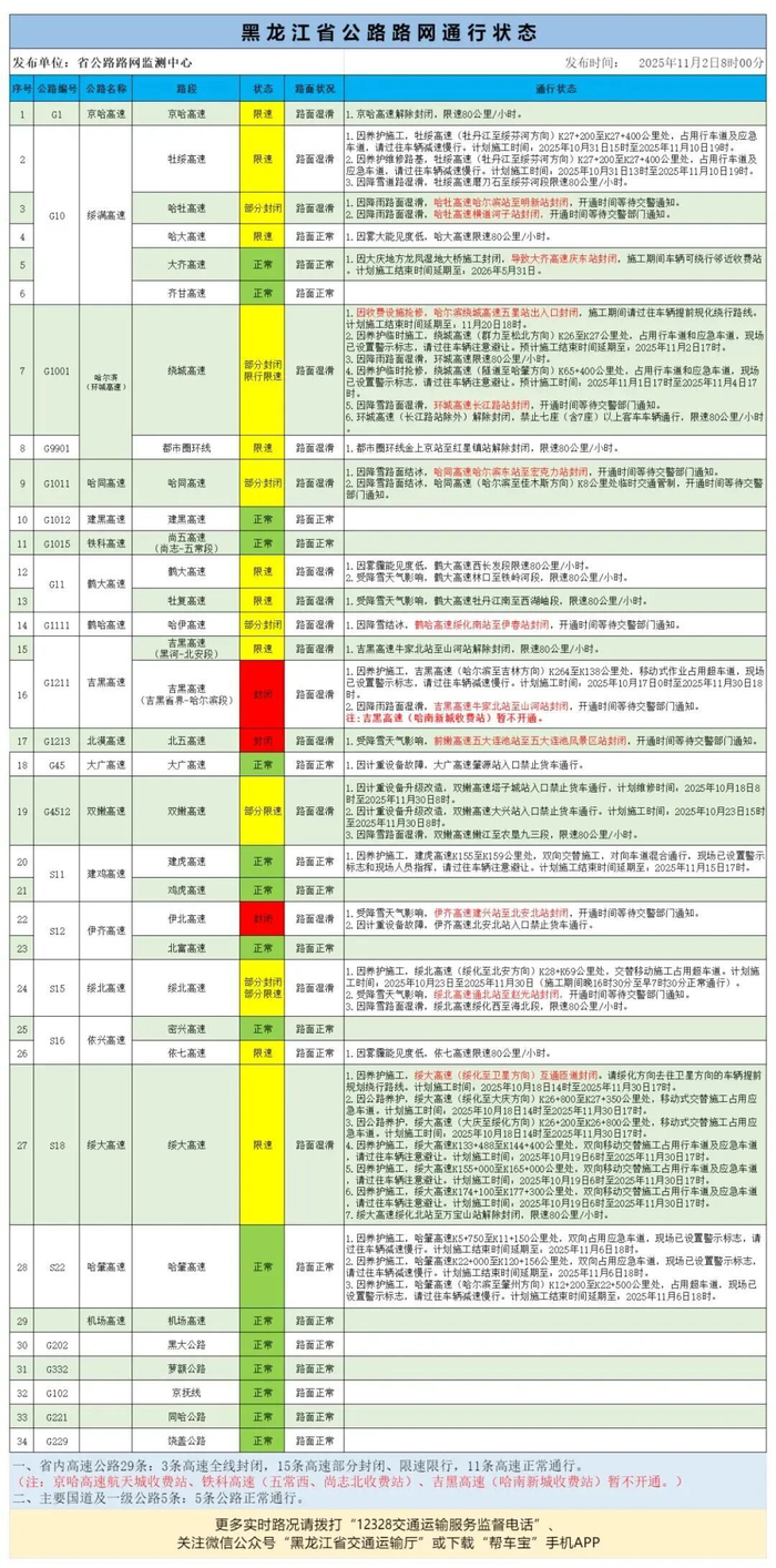 11月2日8时汇总路况信息:全线封闭的高速有(3条高速):伊北高速、吉黑高速(黑河-北安段)、北漠高速,封闭。部分封闭限速限行的高速有(15条高速):1.京哈高速、牡绥高速、绥北高速(绥化西至海北站)、鹤哈高速(绥化南至庆安站)、哈尔滨绕城高速、哈大高速、依七高速、鹤大高速(西长发、林口至铁岭河站)、双嫩高速(嫩江至农垦九三站)、牡复高速、哈尔滨绕城高速(长江路站除外)、吉黑高速(吉黑省界-哈尔滨站)、都市圈环线、绥大高速(绥化北至万宝山站),限速80公里/小时。2.绥北高速(通北至赵光站)、鹤哈高速(绥化南至伊春站)、哈同高速(哈尔滨东至宏克力站)、哈牡高速(哈尔滨至横道河子站)、哈尔滨绕城高速(长江路),封闭。省内其它高速路况正常。
