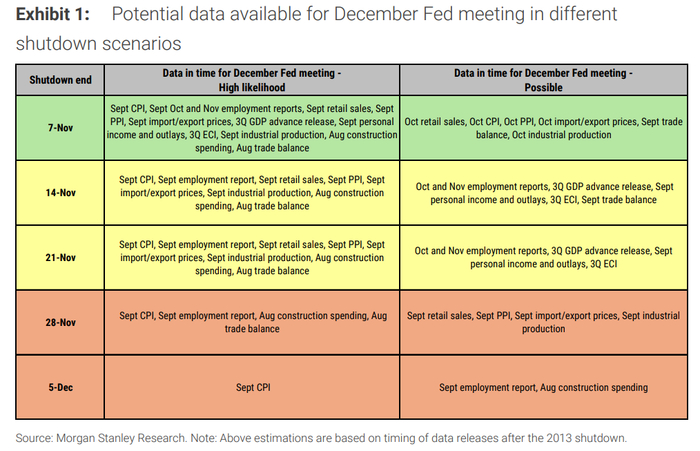 政府关门持续多久,直接决定了美联储决策的数据基础。摩根士丹利的研究报告对此进行了情景分析,该行经济学家Michael T Gapen的团队以2013年的政府关门事件为参照,预测了不同关门结束日期下,美联储可能获得的数据。
