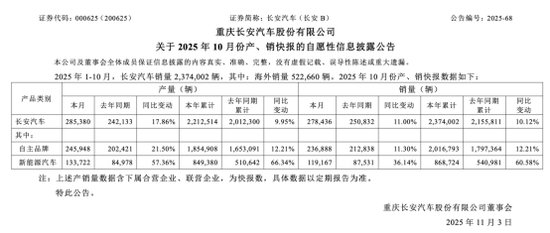 长安汽车11月2日的公告显示,公司10月新能源汽车销量为11.92万辆,同比增长36.14%;今年前10月其新能源汽车累计销量达86.87万辆,同比大幅增长60.58%。
