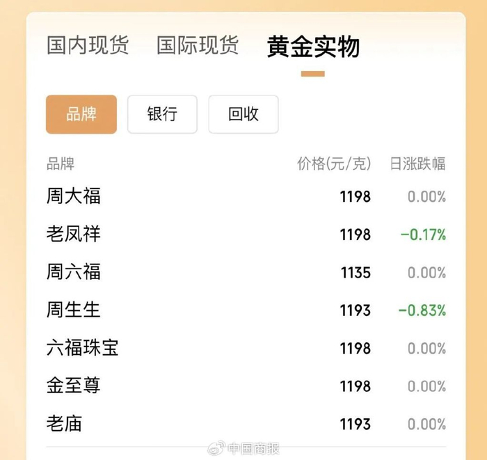 11月2日,周大福、老凤祥、六福珠宝、金至尊足金克价为1198元/克。周生生、老庙黄金足金克价为1193元/克。