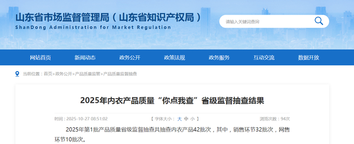 山东省市场监管局发布2025年内衣产品质量“你点我查”省级监督抽查结果