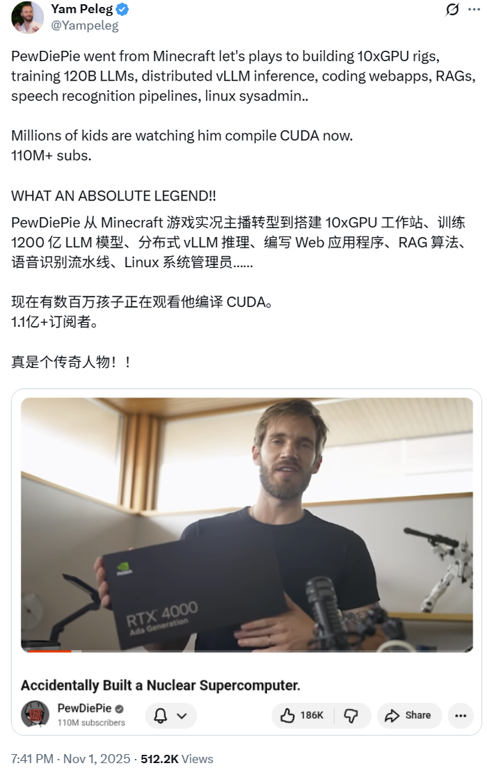 上周末,PewDiePie 久违地发布了新视频,出乎人们预料的是,内容是在教你训练 AI 大模型。