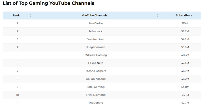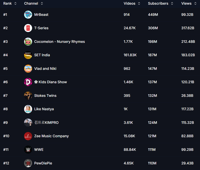 根据 vidiq 的统计,PewDiePie 目前是 YouTube 上排名第 12 的大播主。
