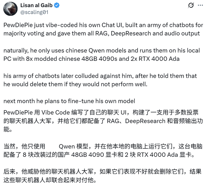 值得注意的是,PewDiePie 的很多工作流程都是 vibe coding。X 博主 @scaling01 总结说:PewDiePie 全凭感觉「vibe-coding」出一个聊天 UI,并打造了一支配备了 RAG、DeepResearch 和音频输出功能的「机器人军队」。