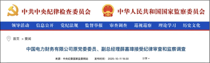 近日,中国电力财务公司原党委委员、副总经理薛嘉璋涉嫌严重违纪违法,接受中央纪委国家监委驻国家电网有限公司纪检监察组纪律审查和甘肃省定西市监察委员会监察调查。