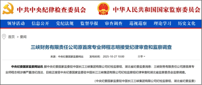 近日,三峡财务公司原首席专业师程志明涉嫌严重违纪违法,接受中央纪委国家监委驻中国长江三峡集团有限公司纪检监察组纪律审查和湖北省监察委员会监察调查。