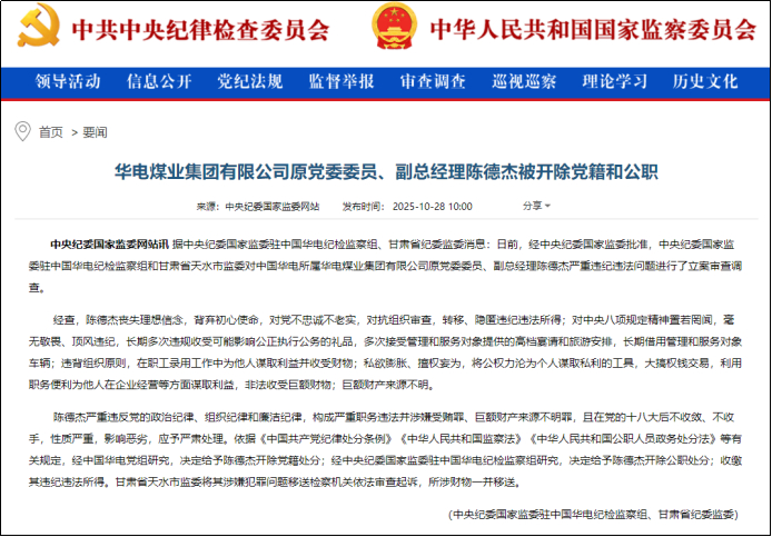 10月28日,中国华电所属华电煤业集团有限公司(以下简称“华电煤业”)原党委委员、副总经理陈德杰涉嫌严重违纪违法被立案审查调查。