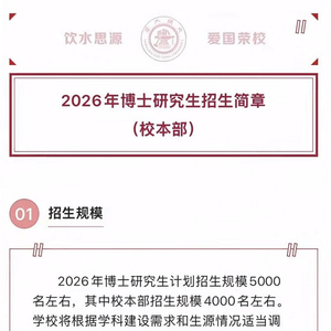 近日,上海交通大学发布2026年博士研究生招生简章,简章显示2026年博士研究生计划招生规模5000名左右,其中校本部招生规模4000名左右。学校将根据学科建设需求和生源情况适当调整,最终招生规模以教育部正式下达的招生计划为准。