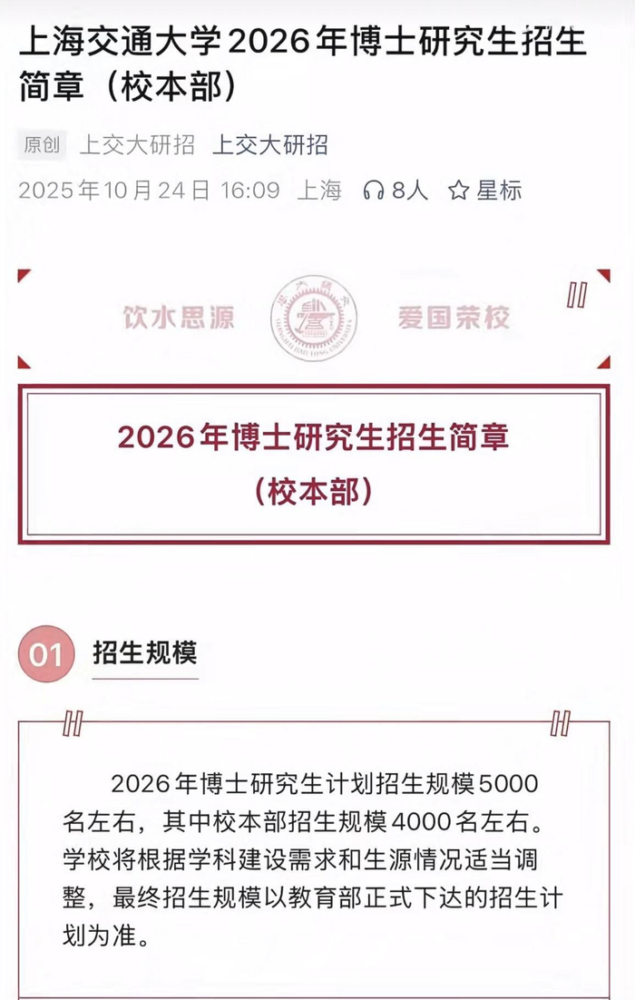 上海交大回应招5000名博士:将根据学科建设需求和生源情况适当调整