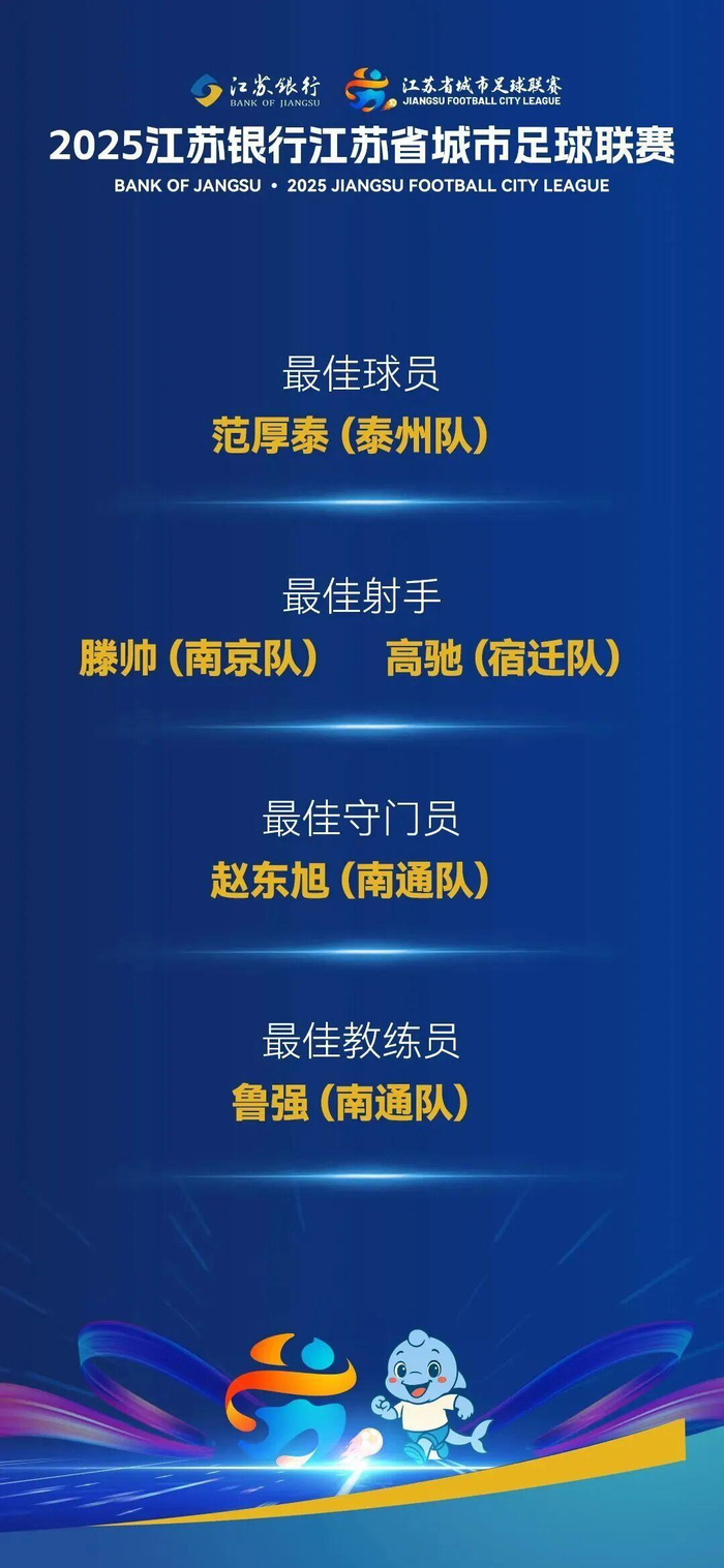 最佳球员:泰州队范厚泰;最佳射手:南京队滕帅、宿迁队高驰;最佳守门员:南通队赵东旭;最佳教练:南通队鲁强。