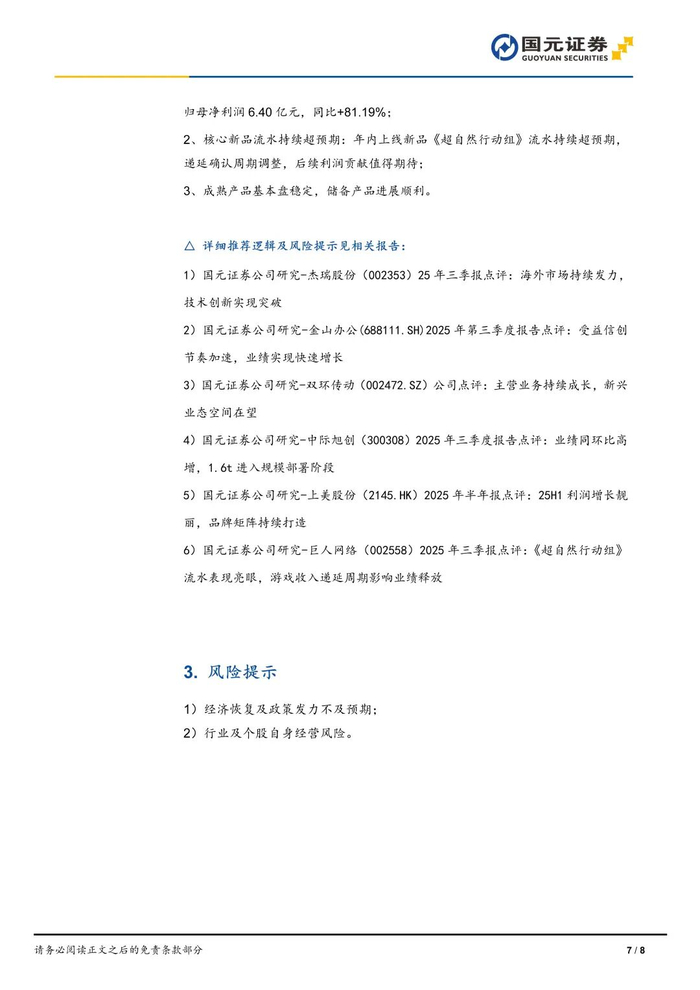 传媒商社:巨人网络,002558.SZ——1、基本面情况优秀,前三季度归母净利润14.17亿元,同比+32.31%,单三季度归母净利润6.40亿元,同比+81.19%;2、核心新品流水持续超预期:年内上线新品《超自然行动组》流水持续超预期,递延确认周期调整,后续利润贡献值得期待;3、成熟产品基本盘稳定,储备产品进展顺利。