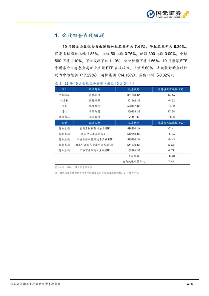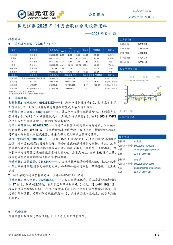本报告摘自国元证券2025年11月3日已发布的《国元证券2025年11月金股组合及投资逻辑——2025年第11期》,具体报告及分析内容请详见报告。若因对报告的摘编等产生歧义,应以报告发布当日的完整内容为准。