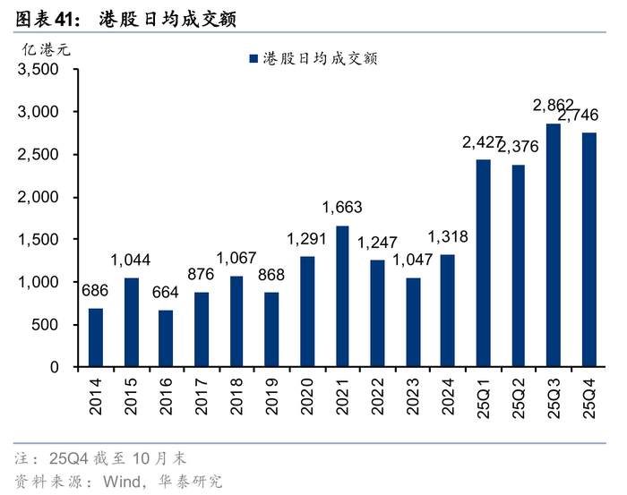 港股流动性修复、交投持续活跃。人民币升值预期不断强化,年初以来港股流动性改善,股票交易活跃。2025年1-9月日均成交额2,563亿港元,同比增长52%;25Q3单季度港股日均成交额2862亿港元,较24Q3增长141%;以流通市值衡量的换手率提升至历史中高水平。