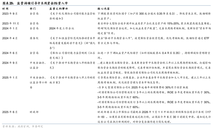 监管多措并举推动中长期资金入市,险资为权益市场未来重要增量。2023年9月金管局下调股票投资风险因子,降低险资配置成本;同年11月窗口指导要求部分险企提升权益占比2024年新"国九条"明确推动中长期资金入市,险资持续加码,25年1月六部门发布《关于推动中长期资金入市工作的实施方案》,提出提升商业保险资金A股投资比例与稳定性,如推动超1000亿元保险资金长期股票投资试点在2025年上半年落实到位,后续逐步扩大参与机构范围与资金规模,此外力争大型国有商业保险公司从2025年起每年新增保费的30%用于投资A股。《方案》中暂未明确新增保费的口径,若分别以人保、人寿等5家大型保险公司2024年新单保费和业务现金流入计算,测算每年入市增量资金分别为3662亿元和1912亿元。