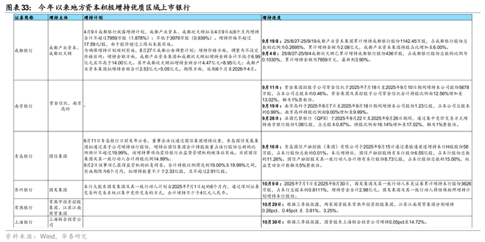 1)地方资本正在积极加大对本地银行股的战略投资。今年以来成都银行、南京银行、青岛银行、常熟银行等优质区域银行都获得了国资股东的大力支持。例如,成都银行获成都国资委控制企业大手笔计划增持,金额不低于7亿元、最高可达近14亿元;青岛银行大股东青岛国信集团也宣布计划增持至少2.33亿股,以巩固控股地位;南京银行则获得本地国资紫金集团、南京高科累计超1.23亿股的增持,地方国资股东对上市银行的增持力度显著增强。